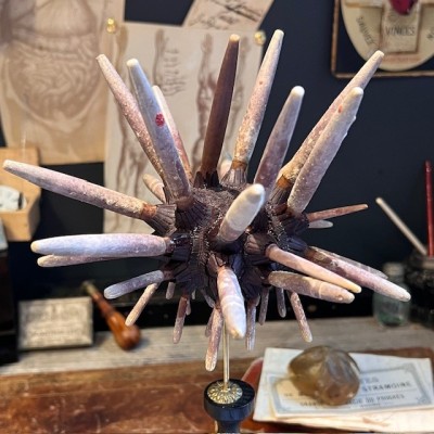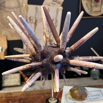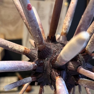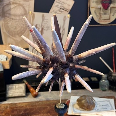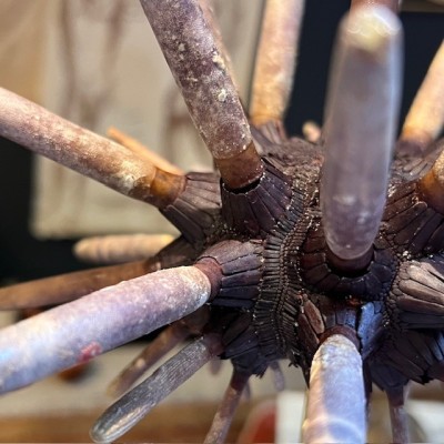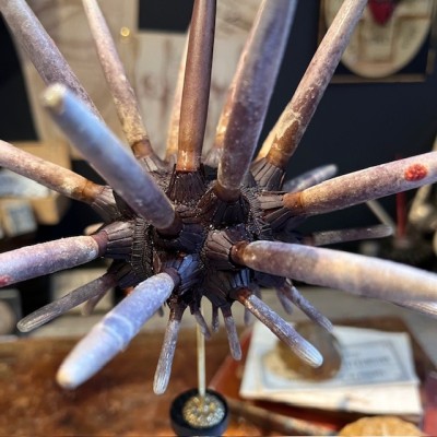 The shell, called a “test”, can measure up to 8 cm in diameter, with spines (called “radioles”) reaching up to 10 cm. The genus is easily recognized by its enormous, thick primary radioles.